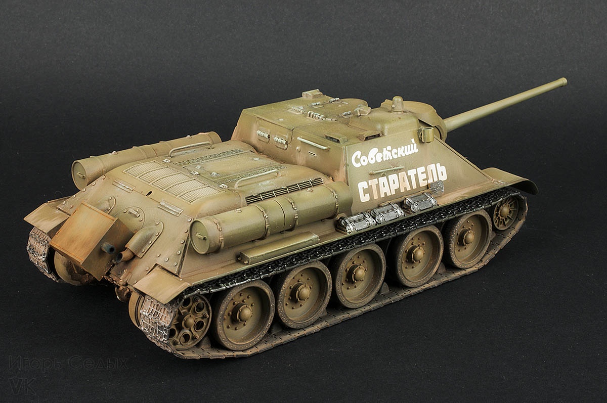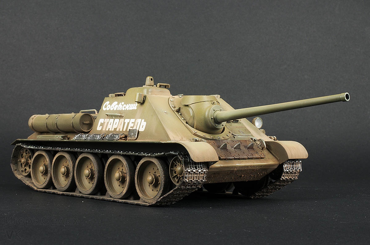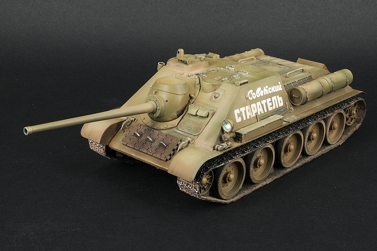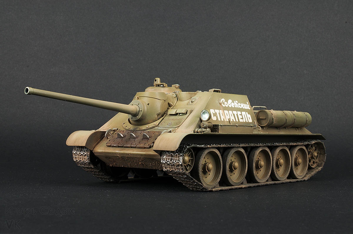 СУ-85 – средняя по массе советская самоходно-артиллерийская установка, относящаяся к классу истребителей танков. СУ-85 активно и успешно использовались с сентября 1943 года до окончания Великой Отечественной войны. Машины выпускались на Уральском заводе тяжёлого машиностроения (Уралмаш) с августа 1943 по июль 1944 года, всего было построено 2337 самоходок. 85-мм пушка Д-5С позволяла СУ-85 эффективно бороться со средними танками противника на дистанциях более километра, а на меньших дистанциях пробивать лобовую броню тяжёлых танков.