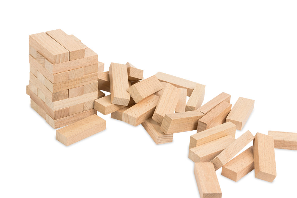2. Первым ходит игрок, построивший башню. В свой ход аккуратно вытащите один любой брусок из башни, исключая два верхних ряда, и положите его на верх башни перпендикулярно предыдущему ряду. Используйте только одну руку. Передайте ход следующему игроку по часовой стрелке. Всегда завершайте полный этаж из 3-х блоков перед тем, как приступить к укладке следующего.