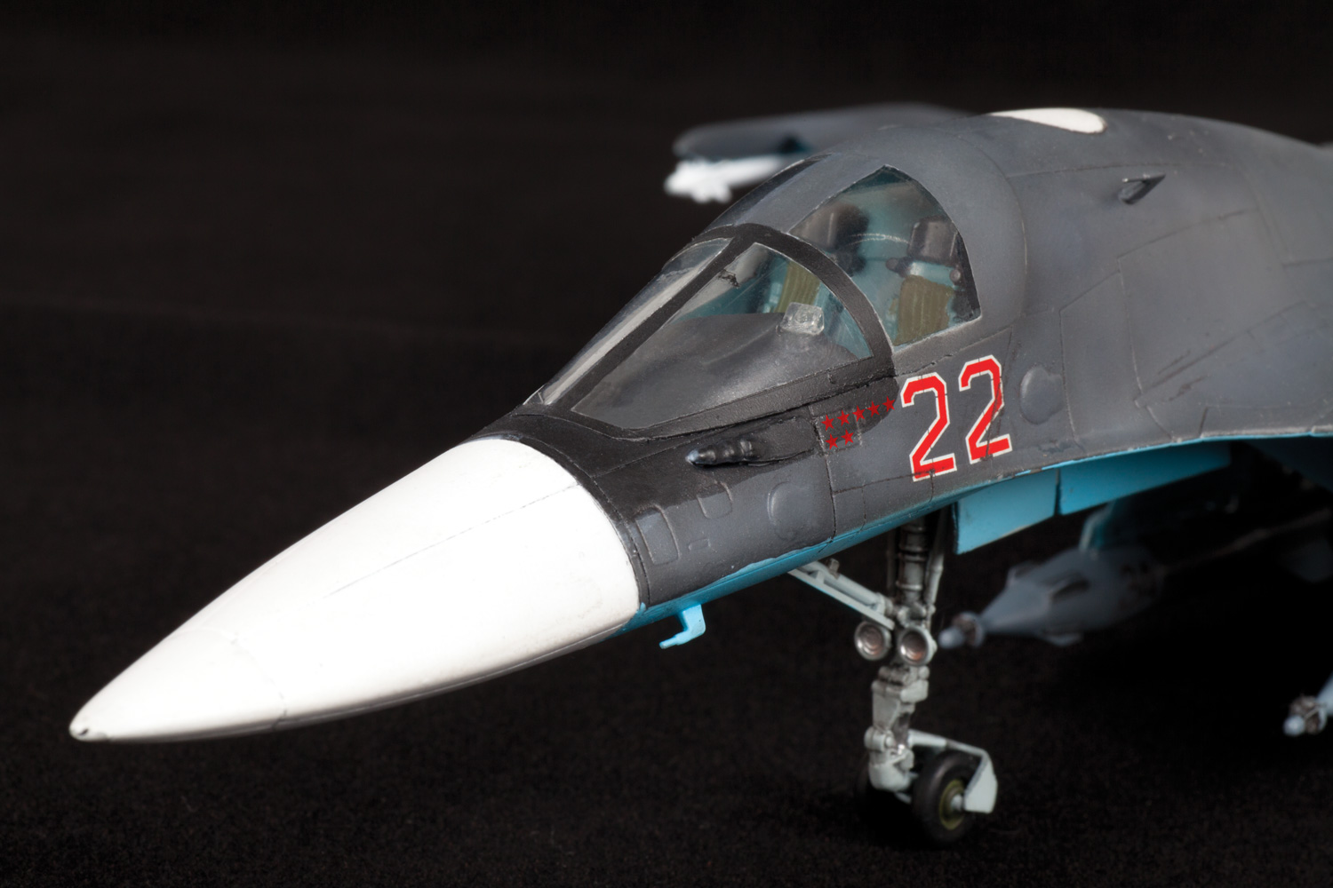 Историческая справка: Су-34 — российский многофункциональный истребитель - бомбардировщик, разработанный для нанесения ударов авиационными средствами поражения по наземным целям в любых метеорологических условиях днём и ночью. В полной мере он проявил свои великолепные лётные и технические качества во время операции в Сирии.