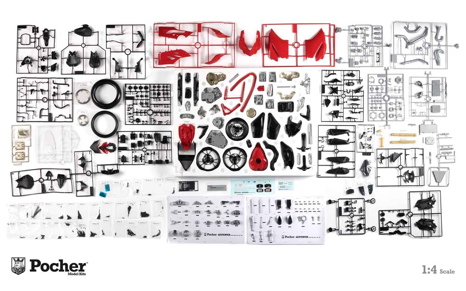 Сборная модель Panigale S в масштабе 1:4 - детали корпуса отлиты из премиум металла и поставляются в уже окрашенном виде. Модель достаточно легко построить, в том числе благодаря подробной инструкции, которая идет уже в комплекте. Модель состоит из более чем 600 деталей, изготовленных из различных материалов таких, как металл, резина и пластик премиум качества. Колеса, цепные передачи, передняя и задняя подвеска, тормоза и рычаги сцепления - все полностью функциональные и предлагают несравненный уровень детализации.