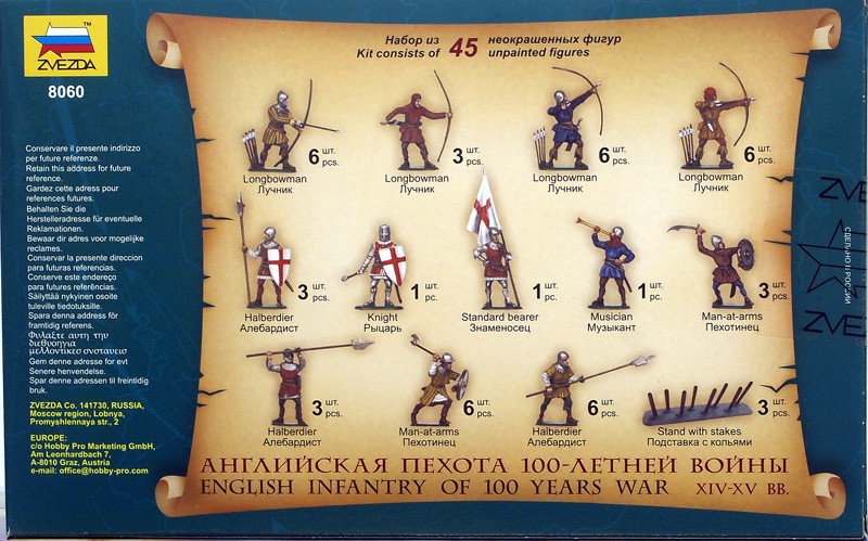 Набор состоит из 45 неокрашенных солдатиков: командир, знаменосец, музыкант, алебардист, пехотинец, лучник.
