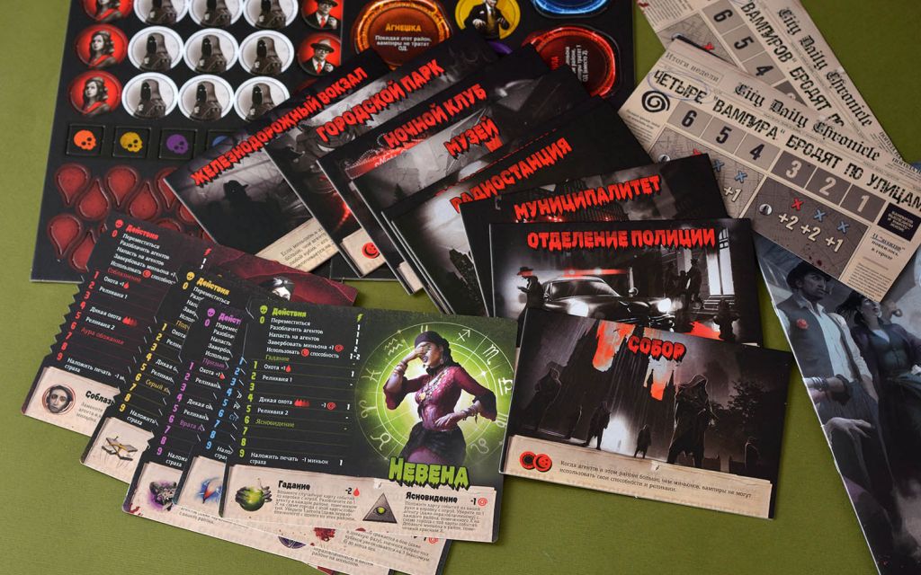 Игра состоит из раундов, которые поделены на две фазы – день и ночь. Естественно, вампиры плетут свои интриги ночью. Днём же вы активируете свойства районов, разыгрываете карту события, а агенты устраивают очередную охоту на вампиров. Ночью вы получаете два очка, которые можете потратить на любое из 12 действий. Стоимость действий различается, есть даже те, которые не тратят ваши очки. Игра заканчивается в трёх случаях: вы провели ритуал Кровавой луны и победили, маркер завесы достиг нуля (это значит, что люди узнали о вас и затравили) и колода событий опустела, а агенты Инквизиции укрепили своё влияние. Как можно понять, вариант выиграть у вас только один – провести ритуал и превратить всех жителей города в послушное стадо.